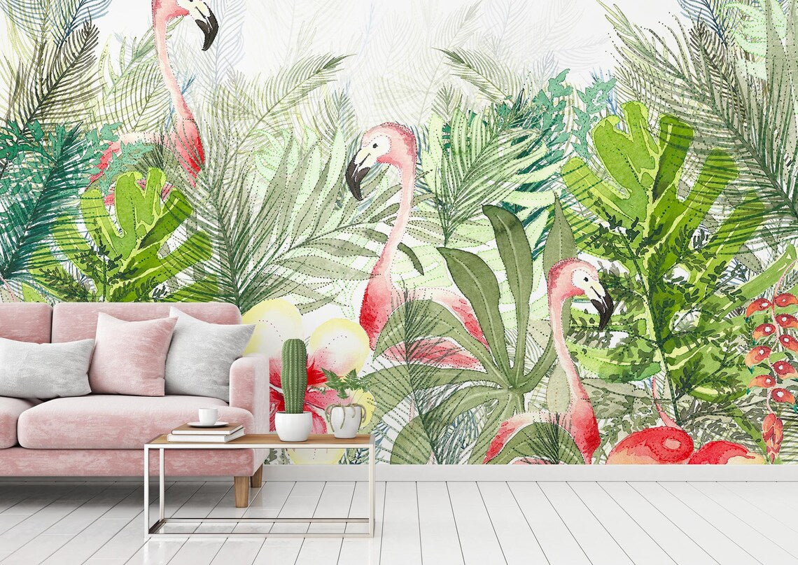 • Living room with a large wall mural of trees and birds, featuring a sofa, chairs, and decorative elements.
