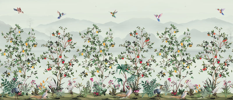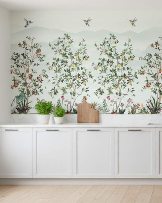 Botanical Grove Wall Mural, Hummingbird Décor, Lush Garden Scene