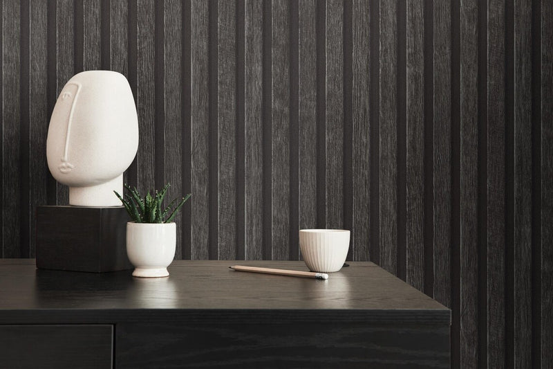Dark Charcoal Black Wood Slat Effect Wallpaper, Textured Vertical Stripe