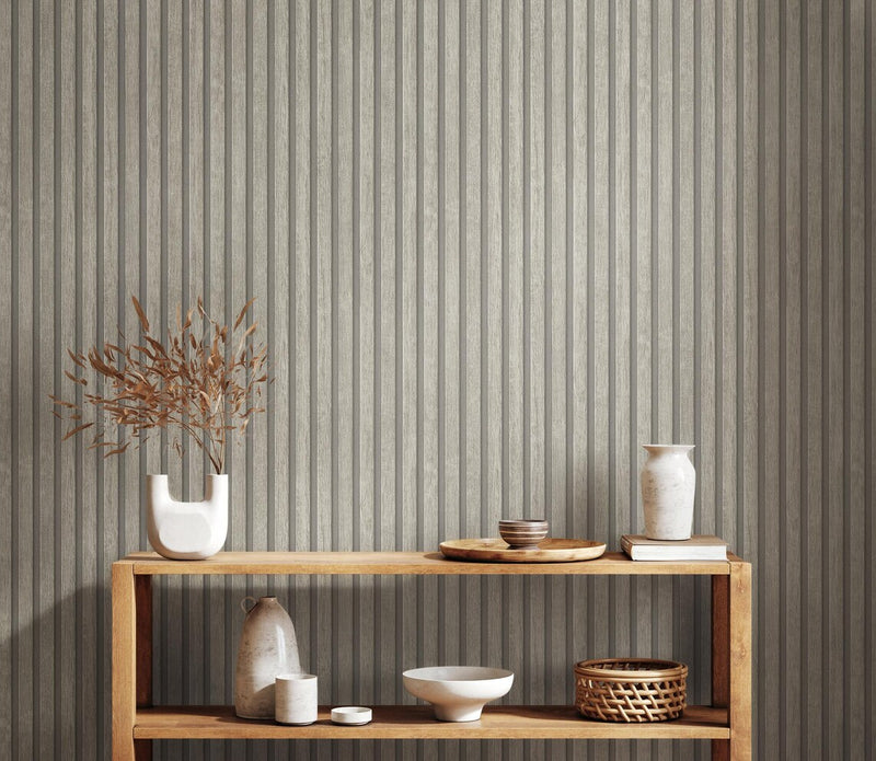 Light Wood Slat Effect Wallpaper, Embossed Grey Taupe Vertical Stripe