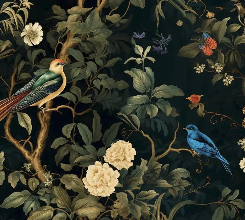 Transform your space with our premium botanical wallpaper, designed to bring timeless elegance and a touch of nature indoors. Featuring lush greenery, exotic birds, and delicate florals against a deep backdrop, this wallpaper creates a stunning statement wall in bedrooms, living rooms, or offices.